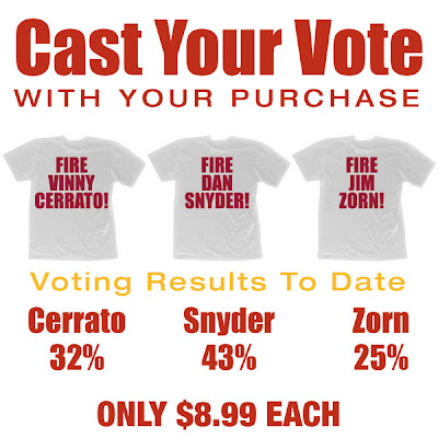 It's no secret that your beloved Redskins are in need of change. Do you part and voice your opinion with the new 'Cast Your Vote' t-shirts. Now available in most of our locations. Who do you think should be fired?